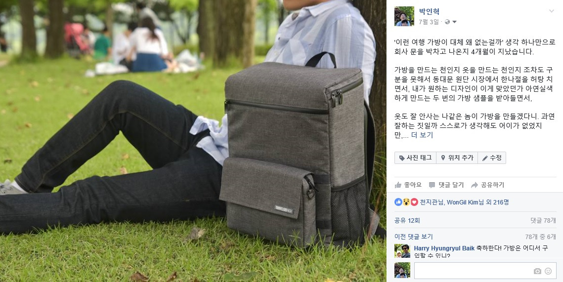 펀딩을 시작하기 며칠 전 페이스북에 글을 하나 썼다. 원래 공개된 장소에 글 쓰는 것을 좋아하지 않기도 하거니와, 별달리 하는 일도 없이 매일 밥만 축내는 듯 하였기에 가방을 만들고 있다고 남들에게 이야기 하는 것이 그동안은 썩 내키지도 않았다. 그렇게 길었던 침묵을 깨고 조심스레 올린 짧은 글 하나. 감사하게도 너무나 많은 분들의 응원과 격려가 이어졌다.
